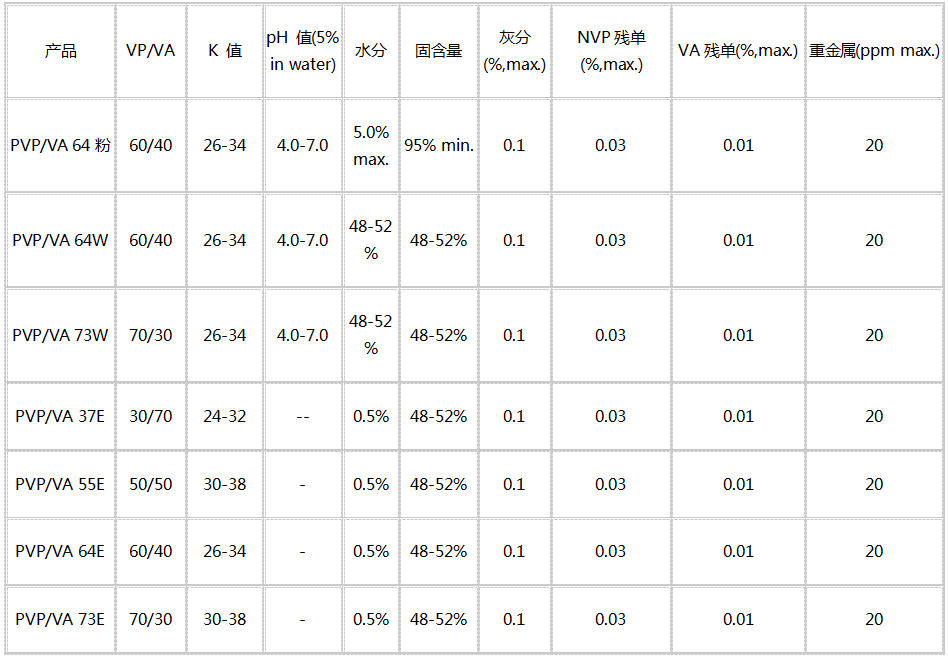產品特性:VP/VA 產品由不同比例的N-乙烯基吡咯烷酮和醋酸乙烯共聚而成的共聚物,以粉末、液體(包括水溶液和酒精溶液)的形態存在。溶于水、乙醇等多種有機溶劑。具有良好的成模性,且膜堅硬、光澤好、易水洗。